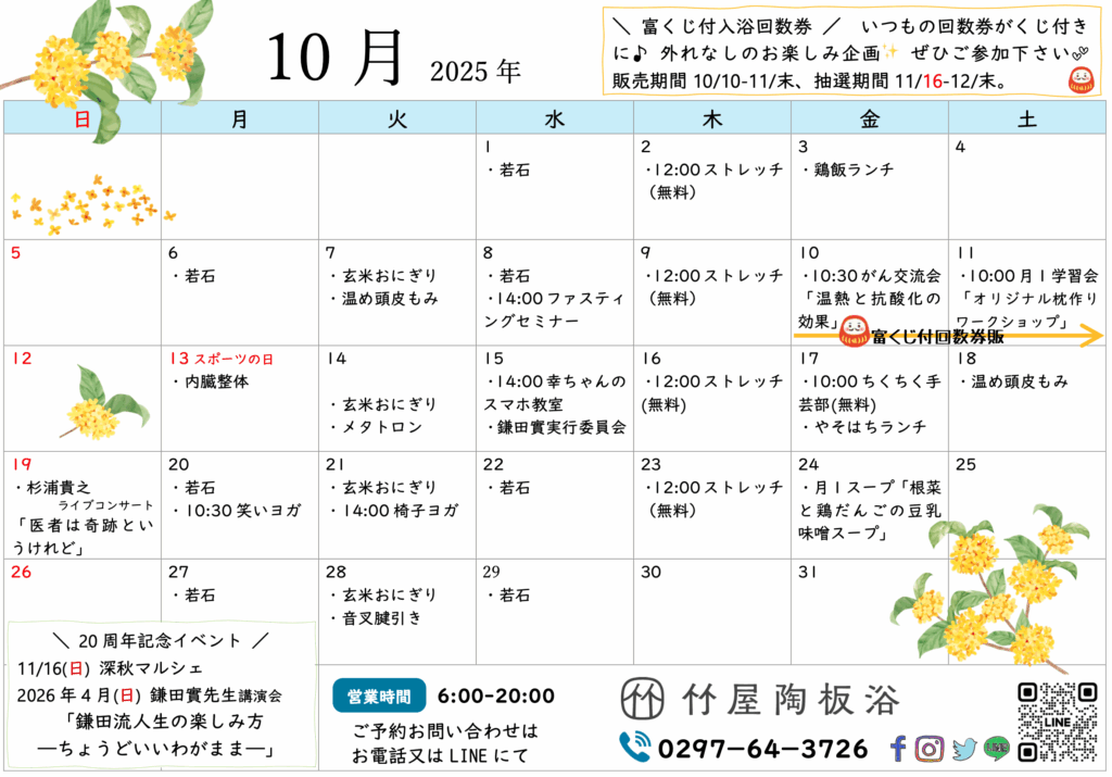 10月10日(金)〜11月末まで富くじ付回数券販売 期間限定で回数券1冊につき、 1回の抽選券が付いてきます。 1等👑 が出たら 11,000円相当の12枚綴り回数券🎯 くじの半分は1回入浴券✨ 必ず当たる、ハズレなし❣️